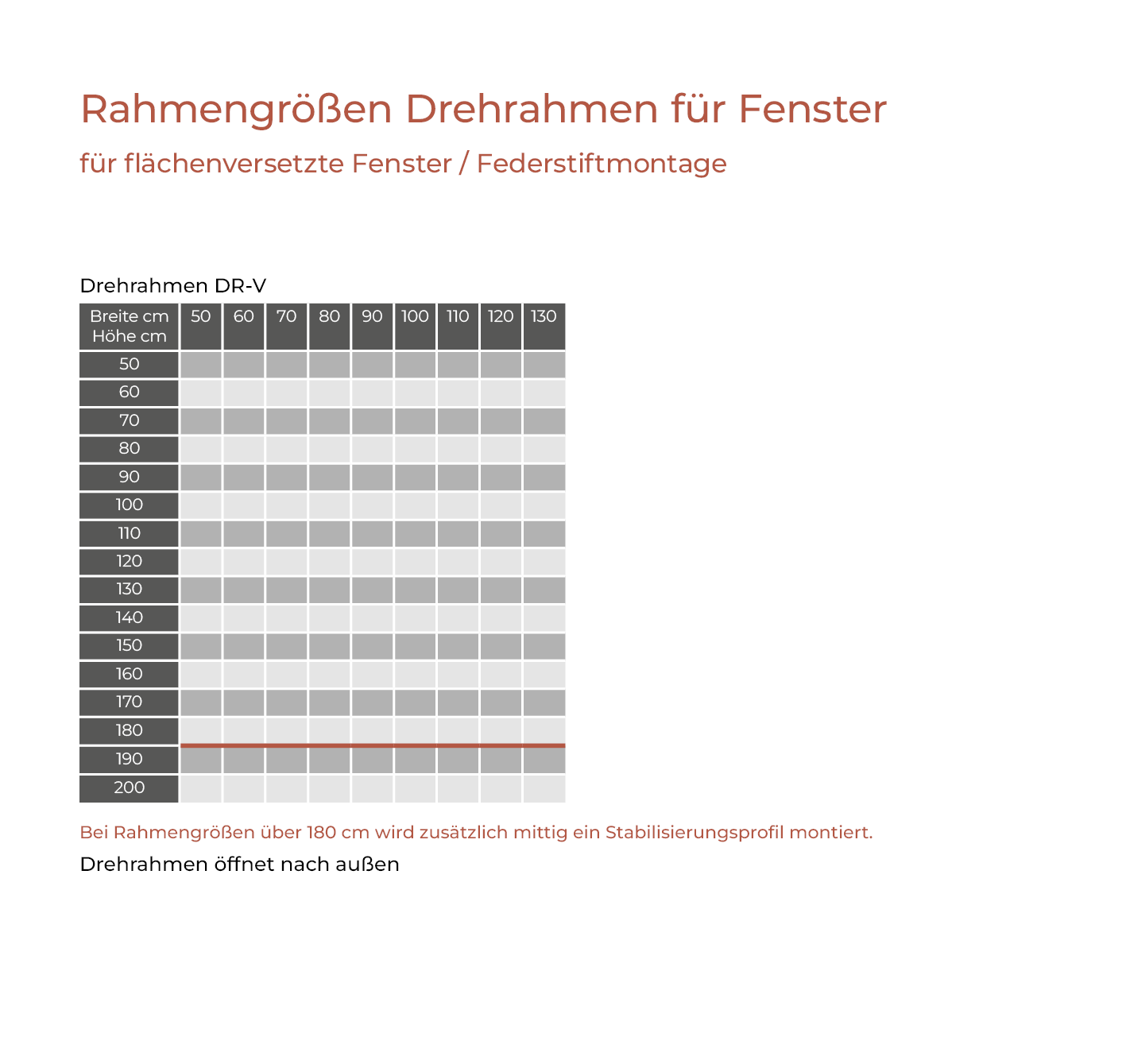 Bei Drehrahmen wird ab einer gewissen Höhe oder Breite (je nach Profiltyp ab 130, 150 oder 160 cm) standardmäßig ein zusätzliches Stabilisierungsprofil eingebaut.