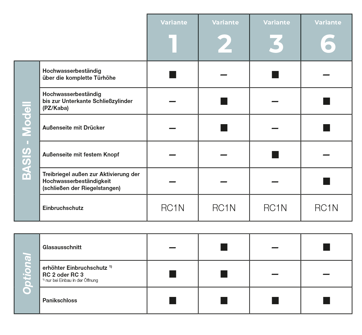 Hochwasserbeständig der IFT Richtlinie FE-07/1 entsprechend. Dichtfunktion bis zu einem Wasserdruck von 3 m Wasserstandssäule bei Variante 1 und 3,