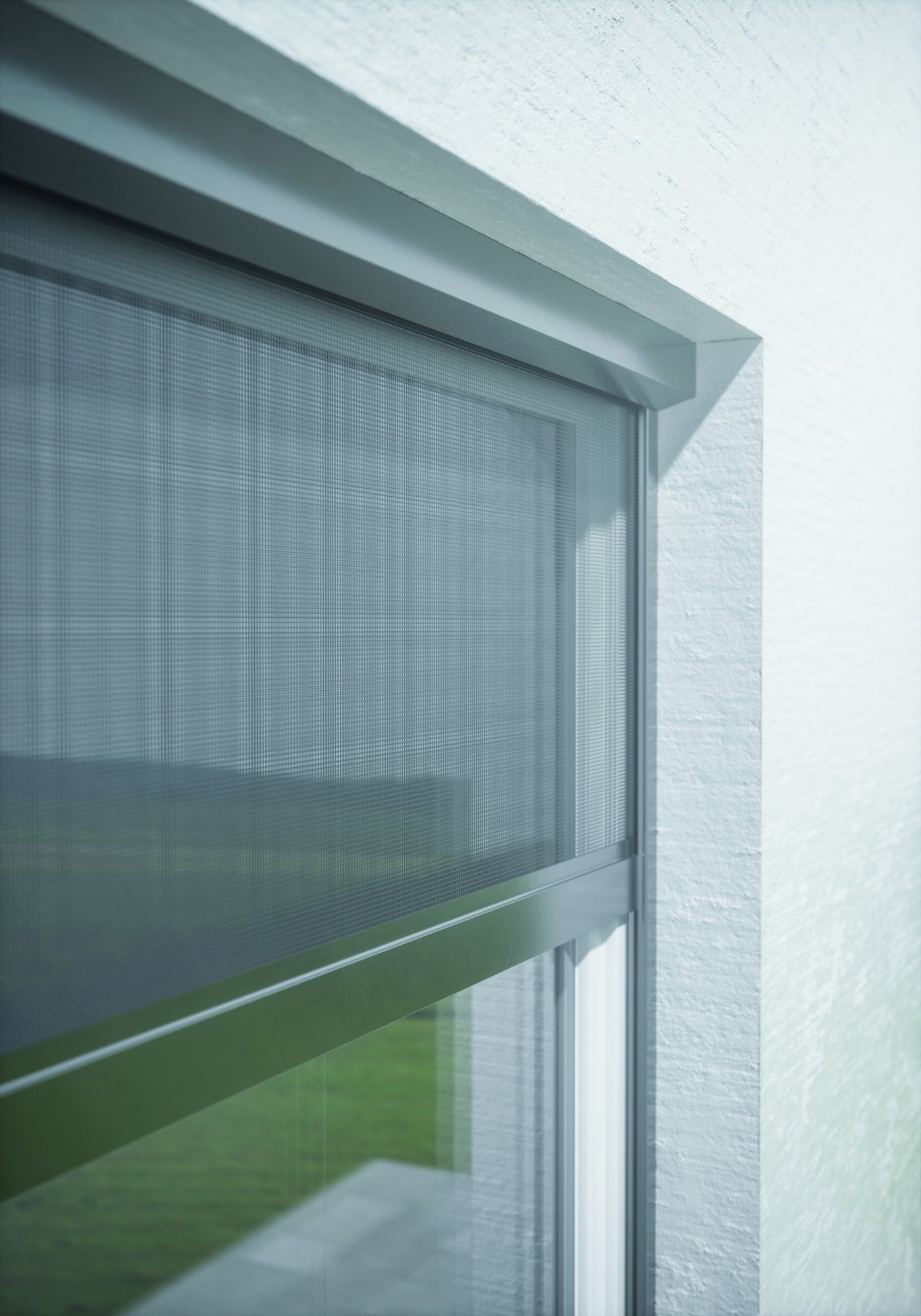 hohe Stabilität und Witterungsbeständigkeit aus. Die Farbauswahl umfasst Standardfarben sowie alle gängigen RAL-Farbtöne auf Wunsch. Die Seitenteile in Weiß oder Schwarz harmonieren mit den PVC-Abschlusskappen der Führungsschienen. Die in den Schienen integrierte Bürstendichtung sorgt für einen geschützten, leisen und leichtgängigen Lauf des Insektenschutzgewebes.