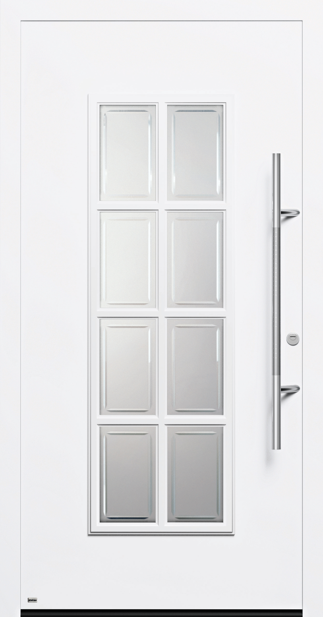 Außenscheibe VSG 8 mm, teilmattiert, im oberen Bereich mit Streifen , Chinchilla weiß, 4 mm, Innenscheibe VSG 10 mm P5A (RC 3-Glas), Zwischenscheibe Float 4 mm, mit teilmattierten Streifen