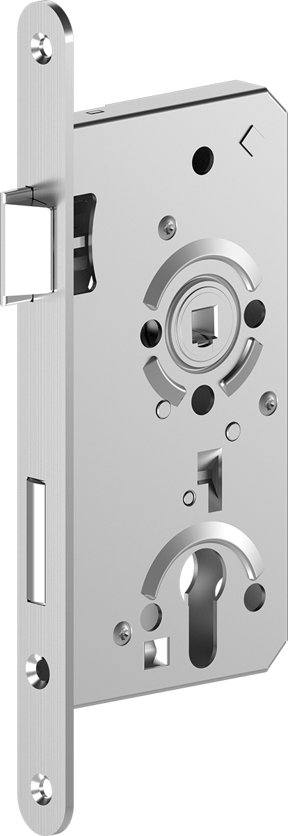 Falle und Riegel aus Stahl verzinkt, mit Führungselementen aus Polyamid zur Reduzierung der Schließgeräusche