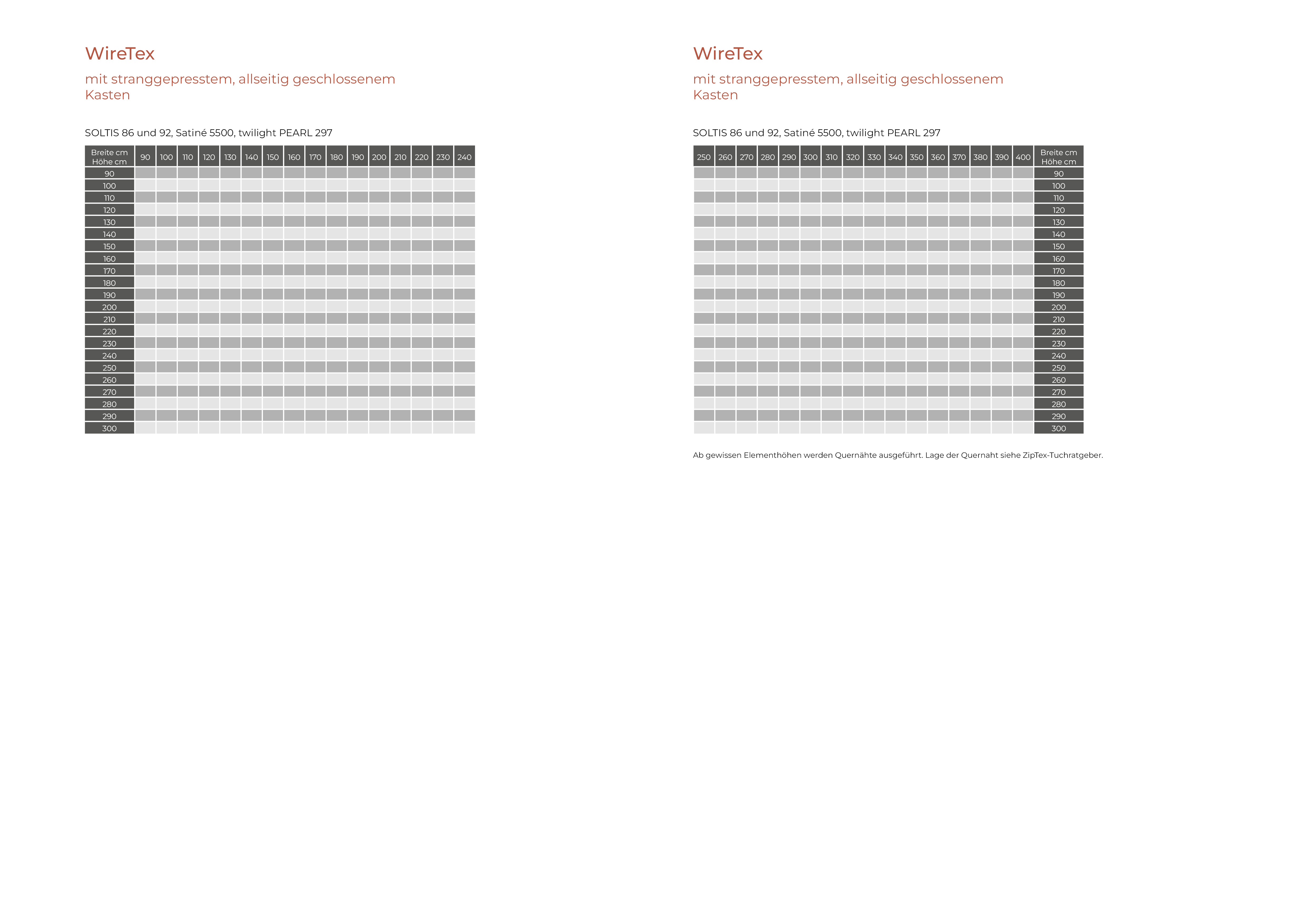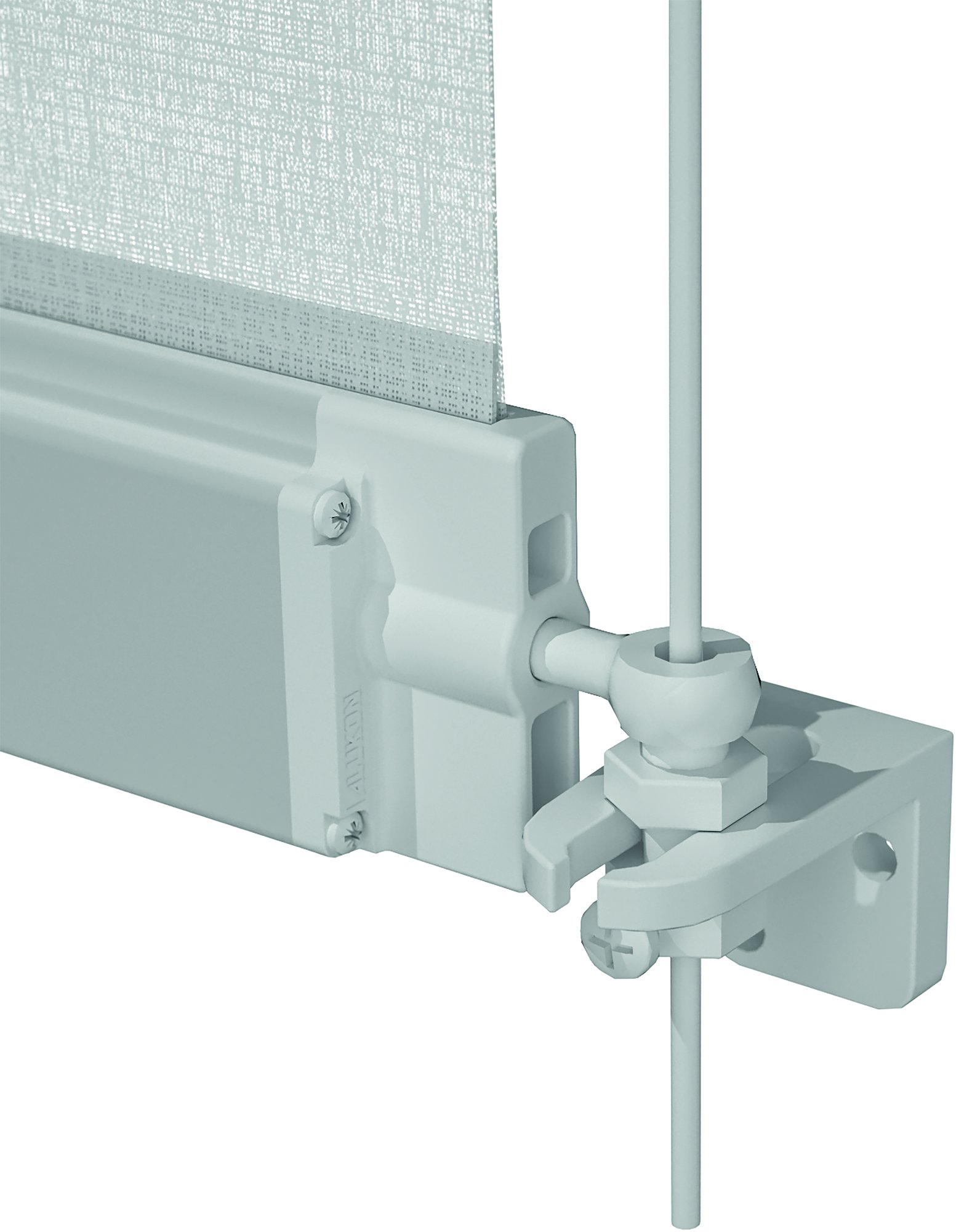 UV-beständig, wasser- und schmutzabweisend und damit äußerst langlebig. Die Tuchführung erfolgt über 3 mm starke Edelstahlseile, die dezent über Abspannwinkel montiert werden – ideal für Situationen, in denen keine Führungsschienen vorgesehen sind, etwa vor Festverglasungen.