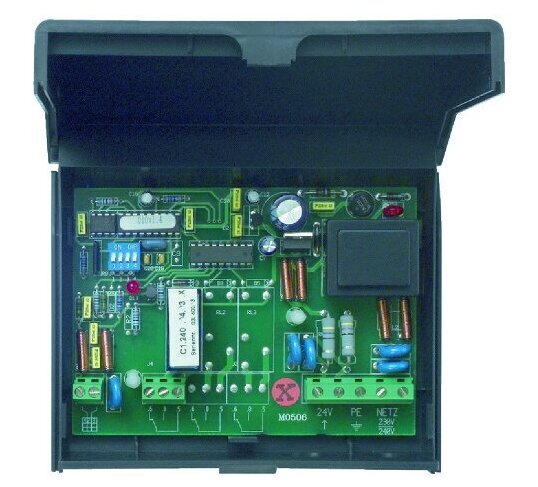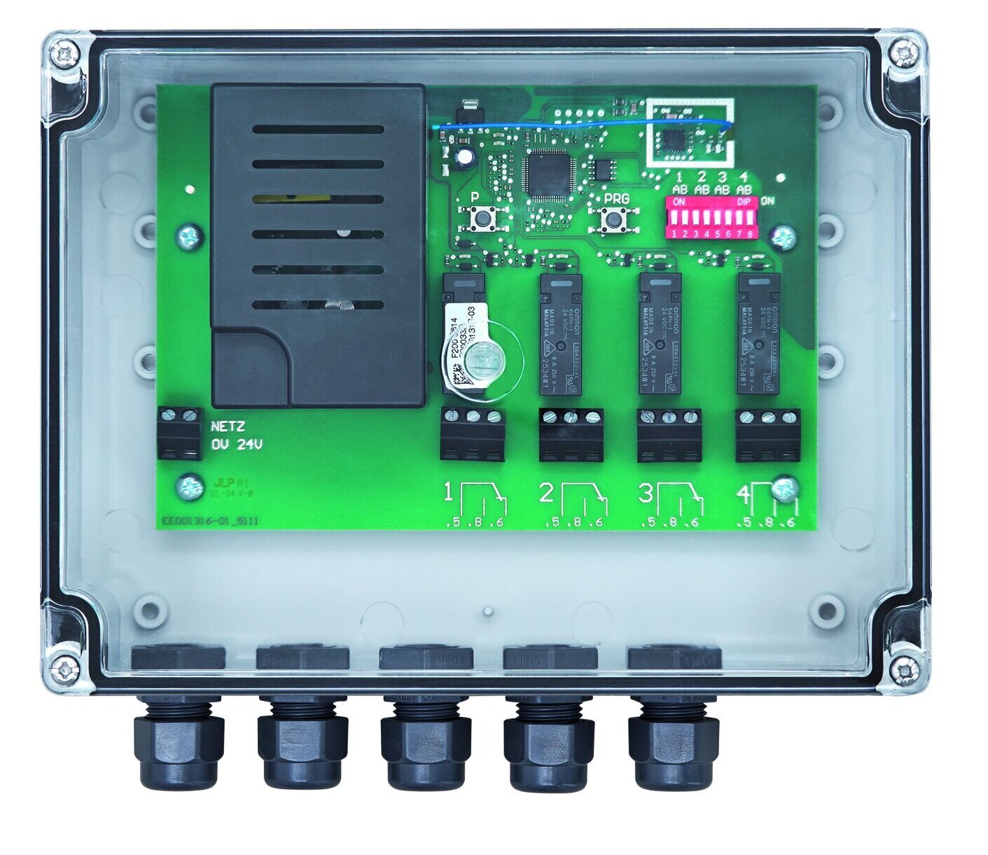 mit 2 potentialfreien Relaisausgängen für Richtungswahl, ein 2-poliger Eingang für potentialfreie Endlagenmeldung Auf und Zu, externe Antenne