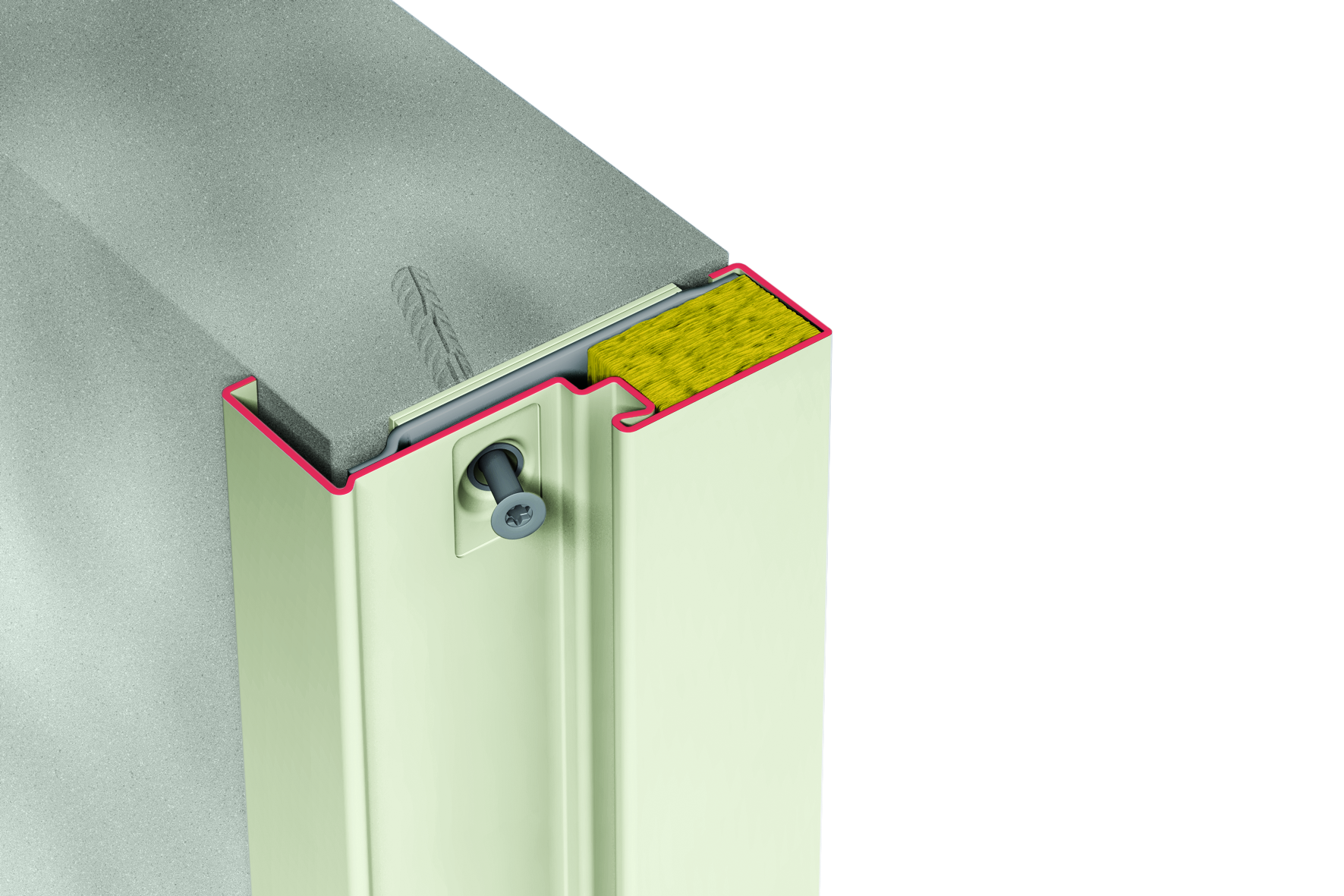 Die Diagonalbefestigung mit einer 100 mm (160 mm bei Porenbeton) Dübelschraube pro Befestigungspunkt sorgt für eine maximale Stabilität der Zarge. Die Befestigungslöcher werden mit Abdeckkappen abgedeckt und liegen verdeckt im Zargenfalz, d. h., sie sind bei geschlossener Tür unsichtbar. Der Einbau ohne Vermörtelung ist optimal für die Montage in Sichtmauerwerk, da das Risiko von Verschmutzungen und Schäden an der Zarge oder am Mauerwerk minimiert wird.