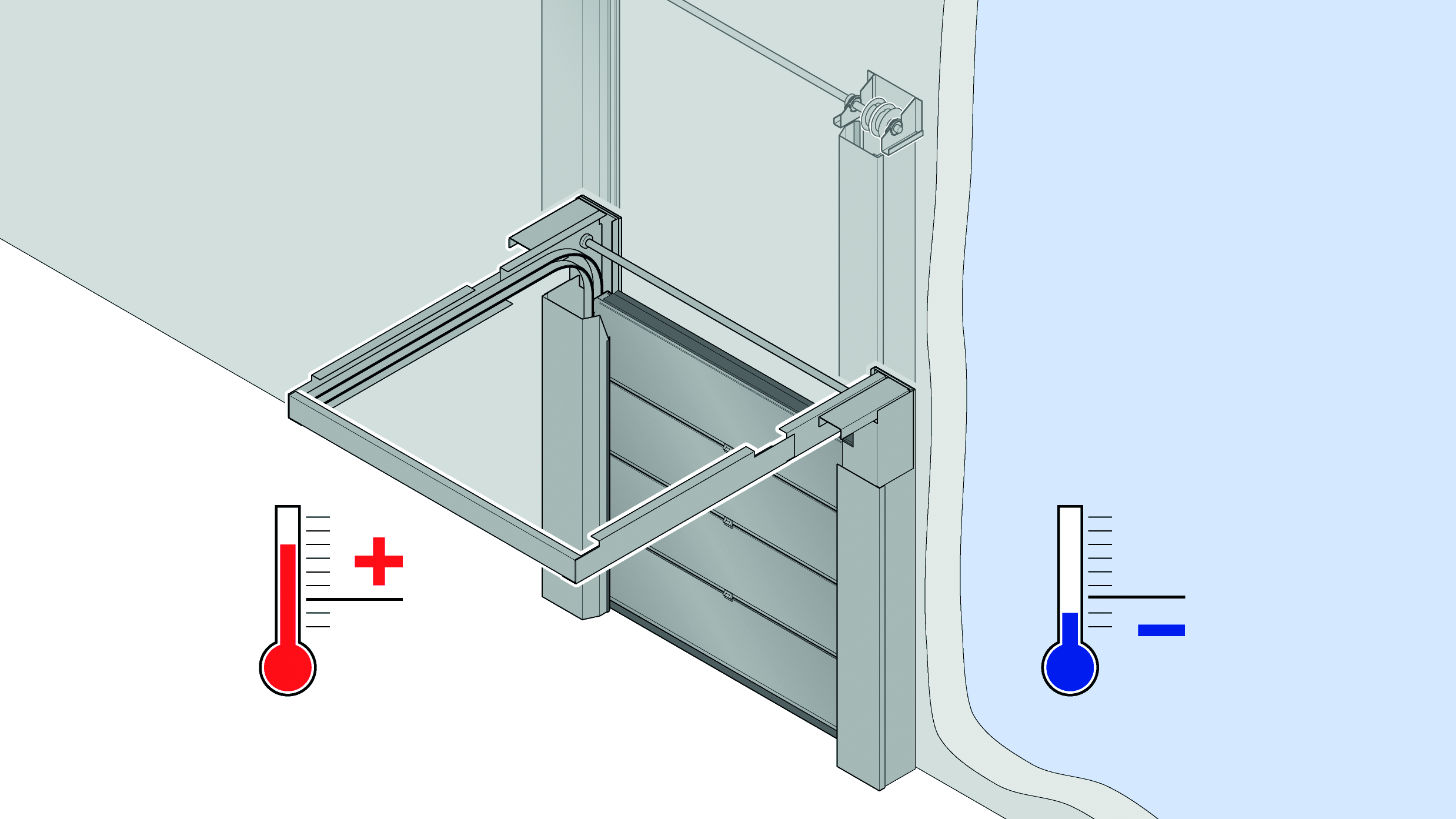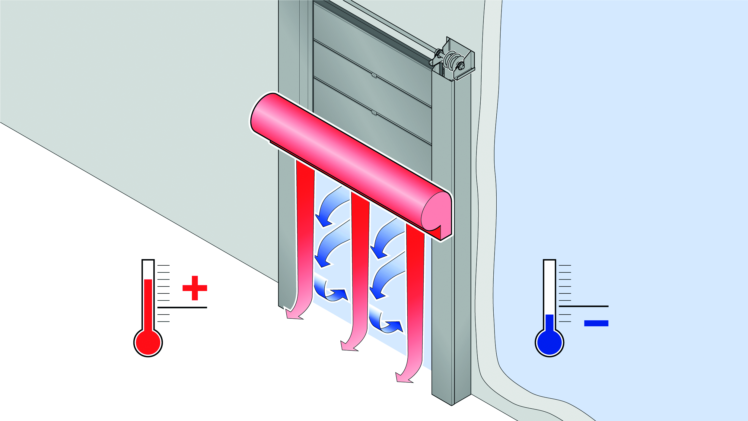 Ein Luftschleier dient zur Minimierung des Temperaturanstieges im Tiefkühlbereich. Er wird auf der wärmeren Seite installiert, um den Luftstrom zur kalten Seite der Öffnung wirksam zu reduzieren.
