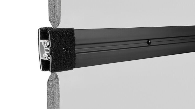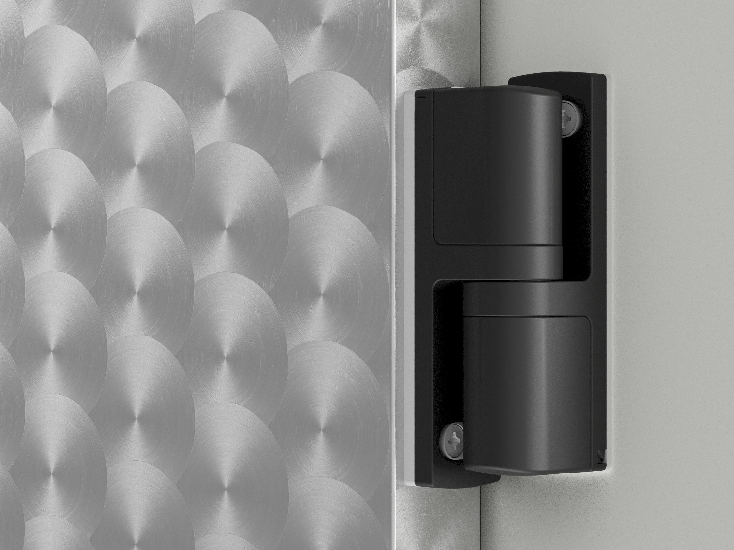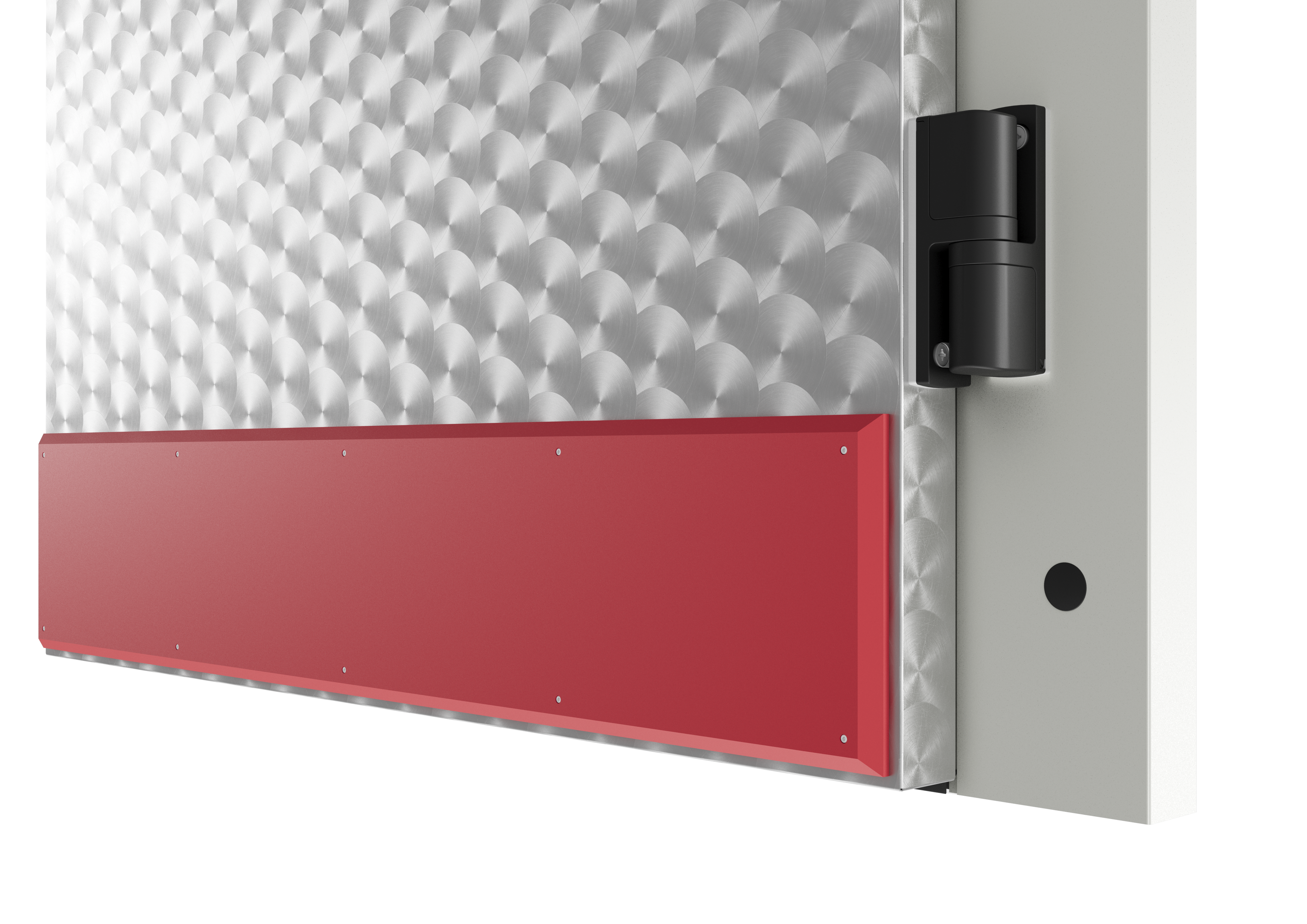 Die wartungsfreien Bänder unserer Isolier-Drehtüren sind steigend ausgeführt und sorgen für eine optimale Abdichtung zum Boden. Gleichzeitig wird der Reibungsweg der Bodendichtung auf ein Minimum reduziert. Für ein modernes Erscheinungsbild sind die Bänder – passend zur Drehtürbetätigung – vollständig in Schwarz gehalten.