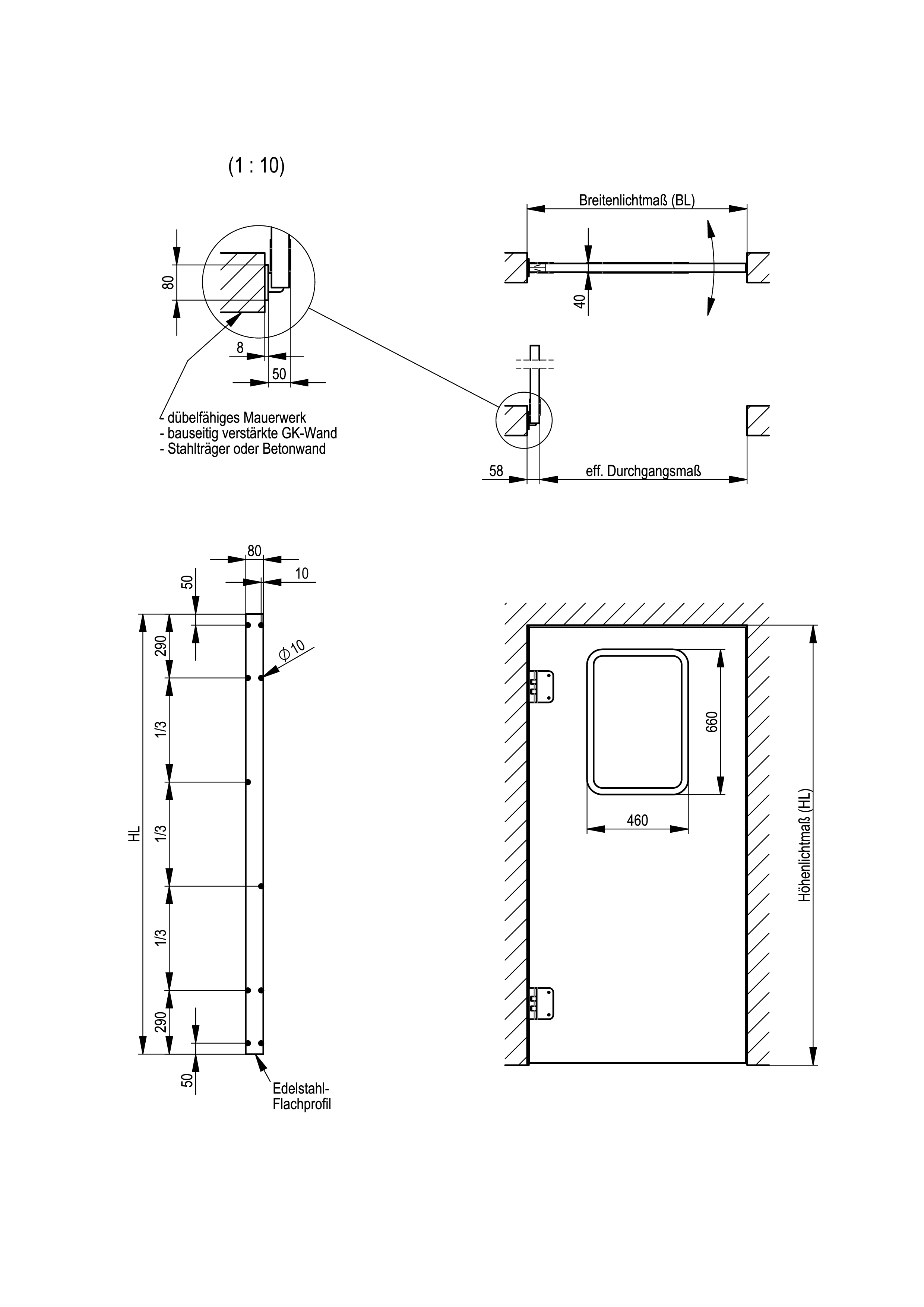 1-flüglige Ausführung, Öffnungswinkel 2 x 90° Breite in mm: 550 - 1.450 Höhe in mm: 1.800 - 2.800