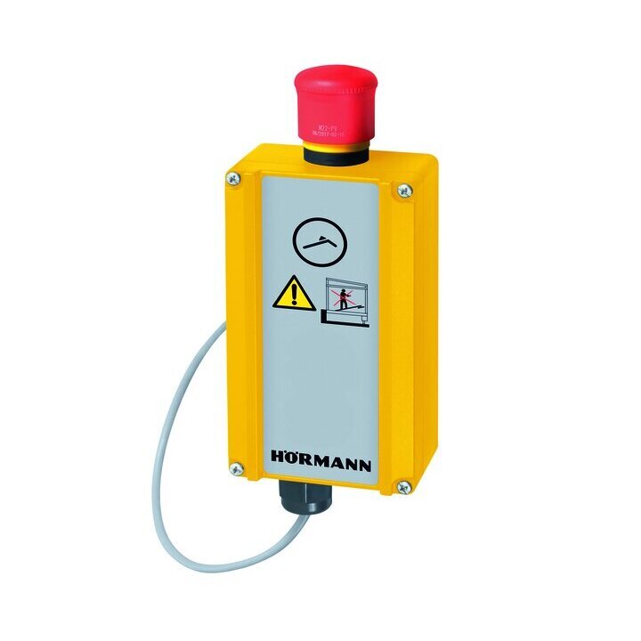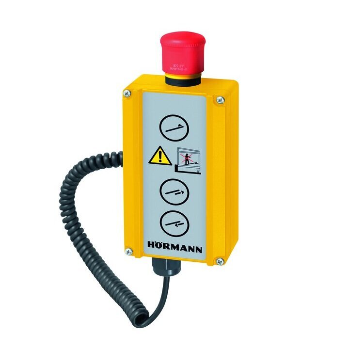 Hörmann Steuerungen sind klar, übersichtlich und eindeutig gestaltet. Eine LED-Leuchte gibt die Betriebsbereitschaft an. Klappkeilladebrücken werden mit nur einem Taster per Dauerdruck bedient. Sobald die Plattform ihren höchsten Stand