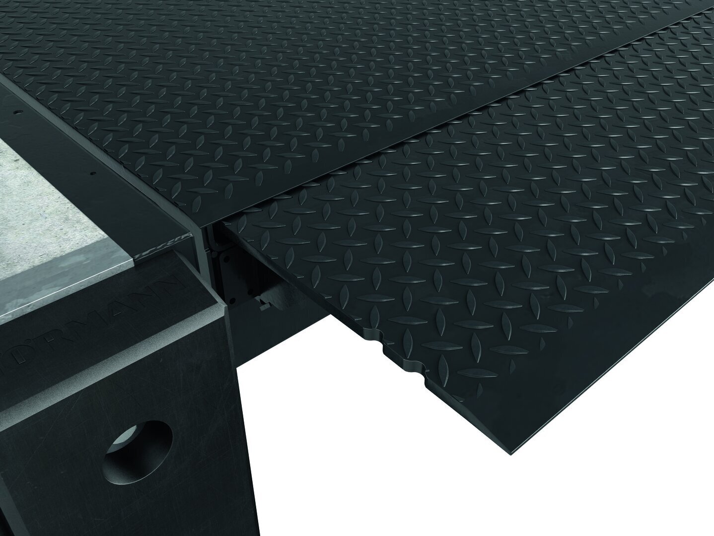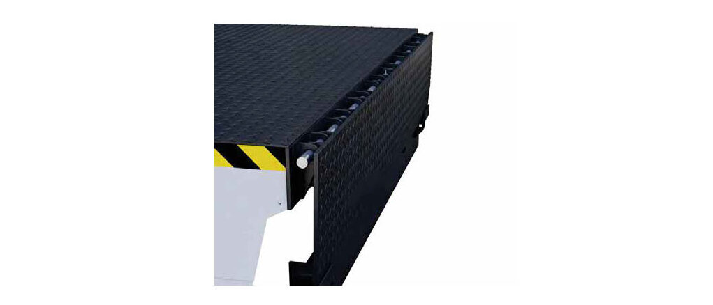 Die Plattform besteht aus profiliertem, rutschhemmendem Stahl S 235 (typisch 6/8 mm), was eine stabile, zugleich verwindungsfähige Fläche schafft. So folgt die Brücke den Bewegungen des LKW-Ladebodens sicher und sorgt für eine ruhige, trittsichere Überfahrt.