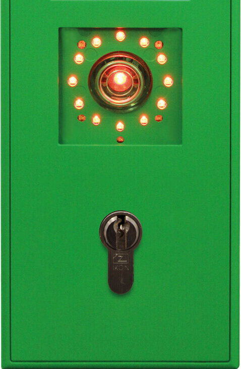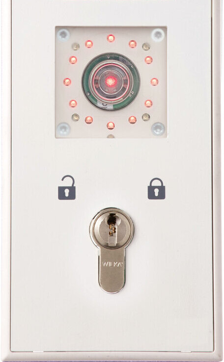 Dank einer Plexiglasabdeckung bleiben versehentliche Alarme kein Problem mehr. Liegt eine behördliche Genehmigung vor, kann die Notfreischaltung verzögert werden, welche durch einen LED Kranz angezeigt wird.