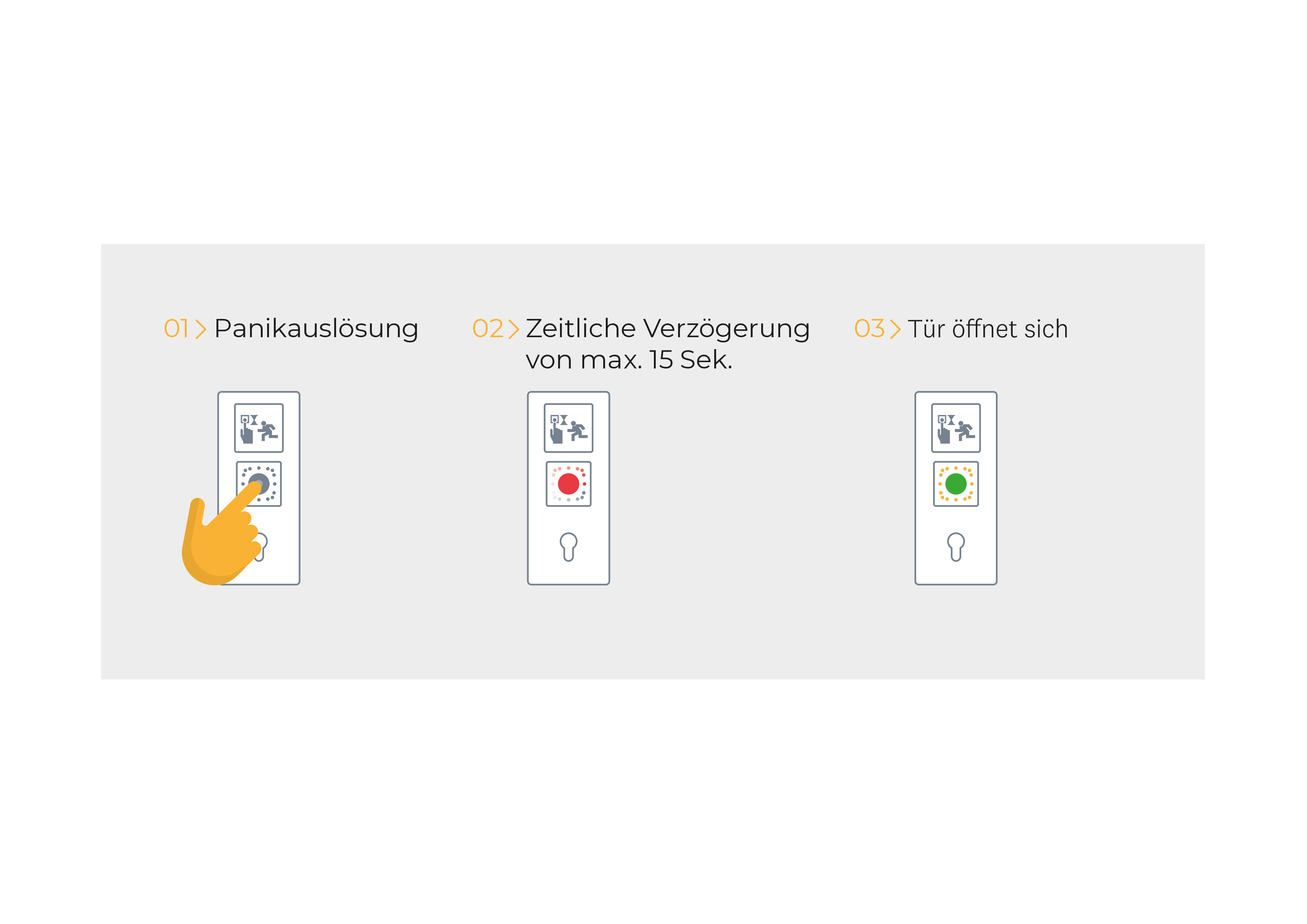 Das Fluchtwegterminal besteht in der Regel aus einer Nottaste in Kombination mit einer Codetastatur oder einem Zylinderschalter und einer LED-Anzeige. Normalerweise können Personen die Tür per Zylinder oder Schlüsselkarte entriegeln und aufschließen, ohne dass ein Alarmsignal ausgelöst wird. Im Notfall kann der Benutzer die Tür vor Ort über die Nottaste entriegeln. In diesem Fall wird vor Ort ein Alarm ausgelöst und ein 15-Sekunden-Countdown startet, bis die Tür entriegelt ist. In Gefahrensituationen kann das Gebäudemanagement die Tür direkt entriegeln, so dass die Zeitverzögerung umgangen wird.