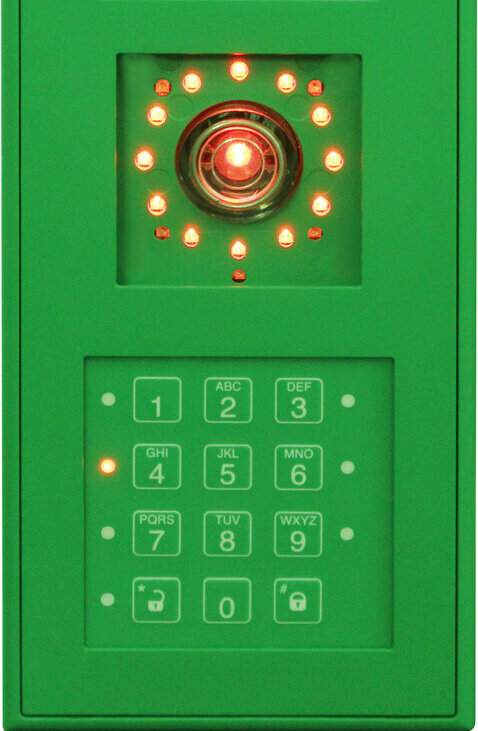 Fluchttürterminal mit Codetastatur, Nottaster und Piktogramm, grün